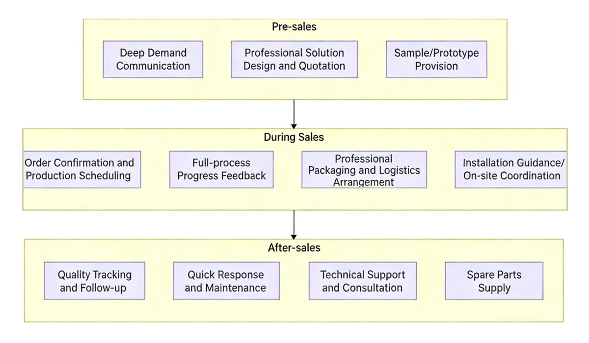 بعد تأكيد الطلب، ستبدأ YeHaoXuan في جدول إنتاج مخصص، مما يسمح لك بتتبع التقدم في الوقت الفعلي؛ بعد الإنتاج، نستخدم التعبئة والتغليف الاحترافية والخدمات اللوجستية الموثوقة، ونقدم إرشادات التثبيت والدعم اللازم في الموقع لضمان تسليم المنتج بسلاسة.